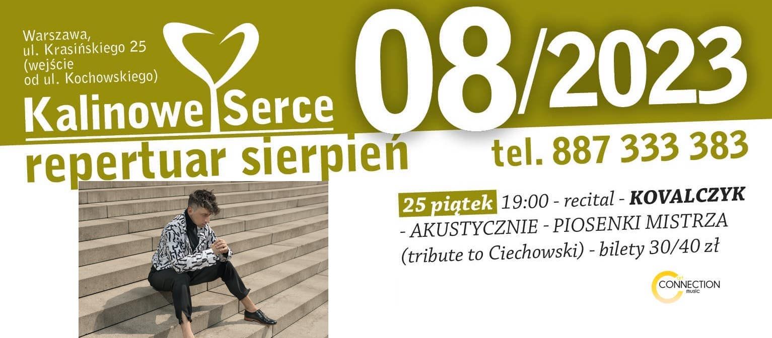 25 sierpnia o godzinie 19:00, po raz pierwszy na scenie Kalinowego Serca, zagoszczą dźwięki niezwykłej muzyki. W tym wyjątkowym wieczorze wystąpi Kovalczyk - ceniony producent muzyczny oraz charyzmatyczny wokalista, wyróżniający się niepowtarzalnym głosem.